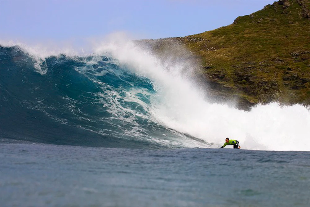 La varietà della costa galiziana è la sua forza. Nel nord, la zona di Ferrolterra ospita alcuni dei beach break più famosi della penisola iberica. Pantín, sede di gare internazionali, è il cuore pulsante della scena surf locale: onde potenti ma ordinate, atmosfera rilassata e lineup amichevole. Poco distante, Doniños si apre in una baia spettacolare, incorniciata da colline verdi; quando il vento soffia da est, regala session perfette con pareti pulite e acqua turchese.