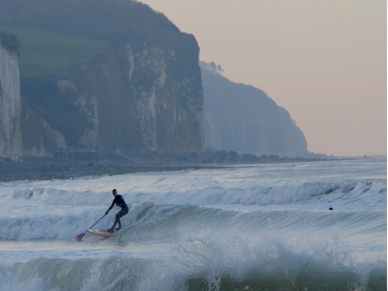 Pourville-sur-Mer è una piccola baia affacciata sulla Côte d’Albâtre, in Normandia, nel nord della Francia, pochi chilometri a sud di Dieppe. La spiaggia si presenta con un ampio litorale di ciottoli che, con il calare della marea, lascia emergere ampie piattaforme rocciose intertidali e lingue sabbiose centrali. Le alte falesie di gesso incorniciano l’anfiteatro naturale e modellano vento e correnti, creando un paesaggio potente e caratteristico. L’accesso è semplice e urbano: si parcheggia lungo il lungomare o nell’area retrostante la spiaggia e in pochi passi si è sull’arenile; passerelle e rampe facilitano il trasporto delle tavole oltre i ciottoli. A ridosso della promenade si trovano ristoranti, bar, alloggi e servizi essenziali; per surf shop più forniti conviene spostarsi a Dieppe o nelle cittadine maggiori del dipartimento. In estate la baia è frequentata da bagnanti e camminatori, ma nelle mezze stagioni l’atmosfera torna quieta e tipicamente normanna. Dal punto di vista del surf, Pourville è un reef-break su lastre con canaloni sabbiosi. L’esposizione principale guarda verso nord con una finestra efficace anche al quadrante ovest: lavorano quindi le ondulazioni con componente settentrionale che percorrono il Canale della Manica e, in alcune finestre, le pulsazioni da ovest quando l’angolo permette all’onda di aggirare i promontori. I picchi si formano in prossimità delle testate rocciose ai lati e su corridoi centrali più sabbiosi: le destre dal lato ovest partono su un take-off deciso e corrono verso il centro con pareti veloci; le sinistre dal lato est sono più brevi e chiudono vicino alla scogliera. Con periodo medio (7–12 s) la qualità sale nettamente; con periodo corto e vento sfavorevole la piattaforma spezza le onde in più sezioni. La marea è la variabile chiave: la media e la medio-alta garantiscono acqua sufficiente sopra le lastre e linee più ordinate; la bassa scopre gran parte della piattaforma rendendo lo spot tecnico e, talvolta, impraticabile; la piena può generare uno shorebreak potente sui ciottoli e backwash marcato. Il vento migliore proviene da sud o sud-ovest (off/side-off), mentre est e nord-est increspano e l’ovest introduce chop laterale. Clima e setup: l’acqua resta fresca tutto l’anno (circa 10–18 °C) e l’aria oscilla mediamente tra 10 e 22 °C. In inverno è consigliabile una 4/3 mm con cappuccio, stivaletti e guanti; in estate una 3/2 mm è in genere sufficiente. Le correnti sono irregolari e possono intensificarsi ai lati della baia e durante le maree vive; attenzione ai ritorni che rimbalzano sotto falesia. L’affollamento di surfisti è in genere basso-medio: la baia richiede lettura, tempismo e rispetto; scegliendo orari mattutini con vento di terra si trovano picchi quasi vuoti. Consigli pratici: osserva i canali sabbiosi per entrare ed uscire, proteggi la tavola sui ciottoli, evita di stazionare sotto i tratti instabili di scogliera e pianifica il rientro prima di affaticarti. Quando la finestra si apre, Pourville regala onde corte ma incisive in un contesto scenografico tra i più iconici della Normandia, in Francia.